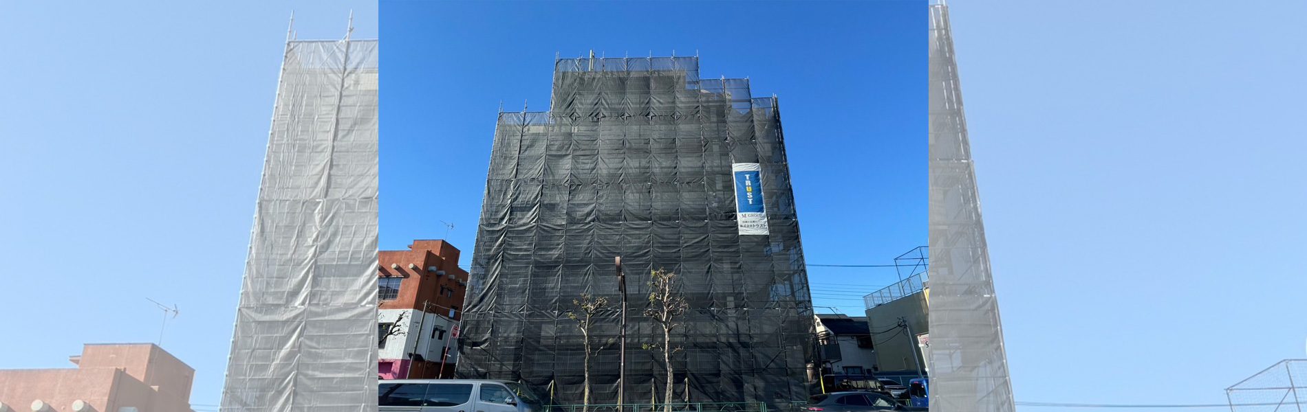 「足場」は、作業員にとって床や通路の役割を果たします。安定した床があるからこそ、作業員は力仕事や緻密な補修作業を正確に行うことができるのです。工事終了後は撤去されてしまう設備ですが、作業員の安全を守り、高品質な工事をお届けするためには欠かせない大切な役割を担っています。また、足場周辺を覆うメッシュシートには、塗料やほこりなどが外部に拡散することを防ぐ役割があります。